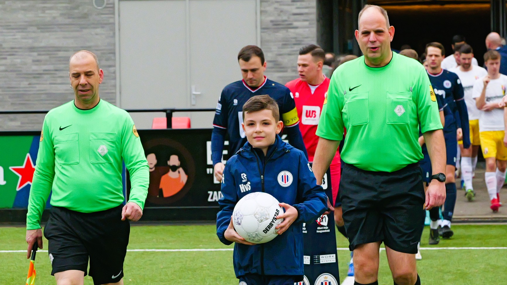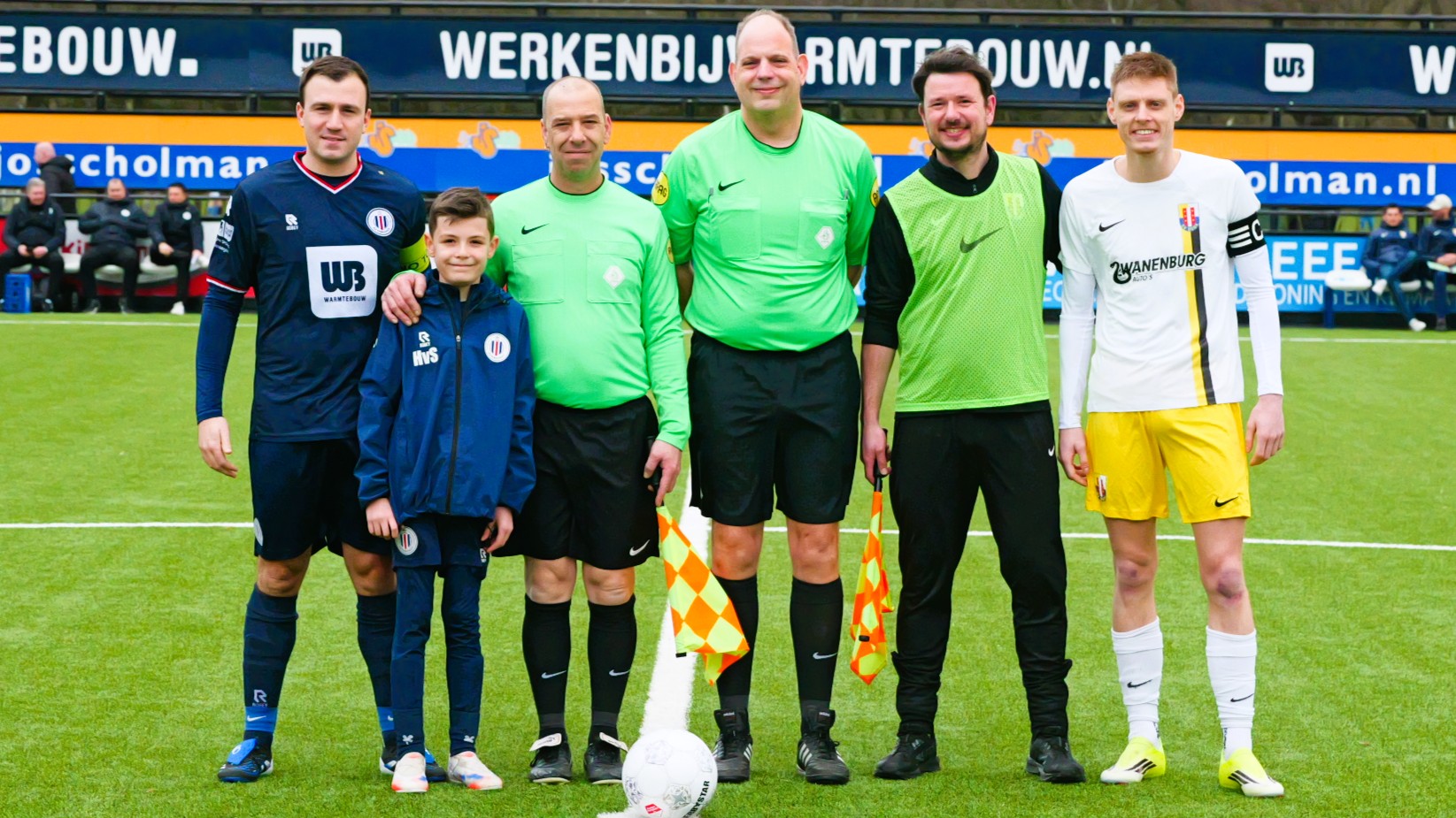 Daarna gingen we het veld op voor de warming up en mocht ik met de wisselspelers een balletje trappen, ook de grensrechter deed lekker mee.