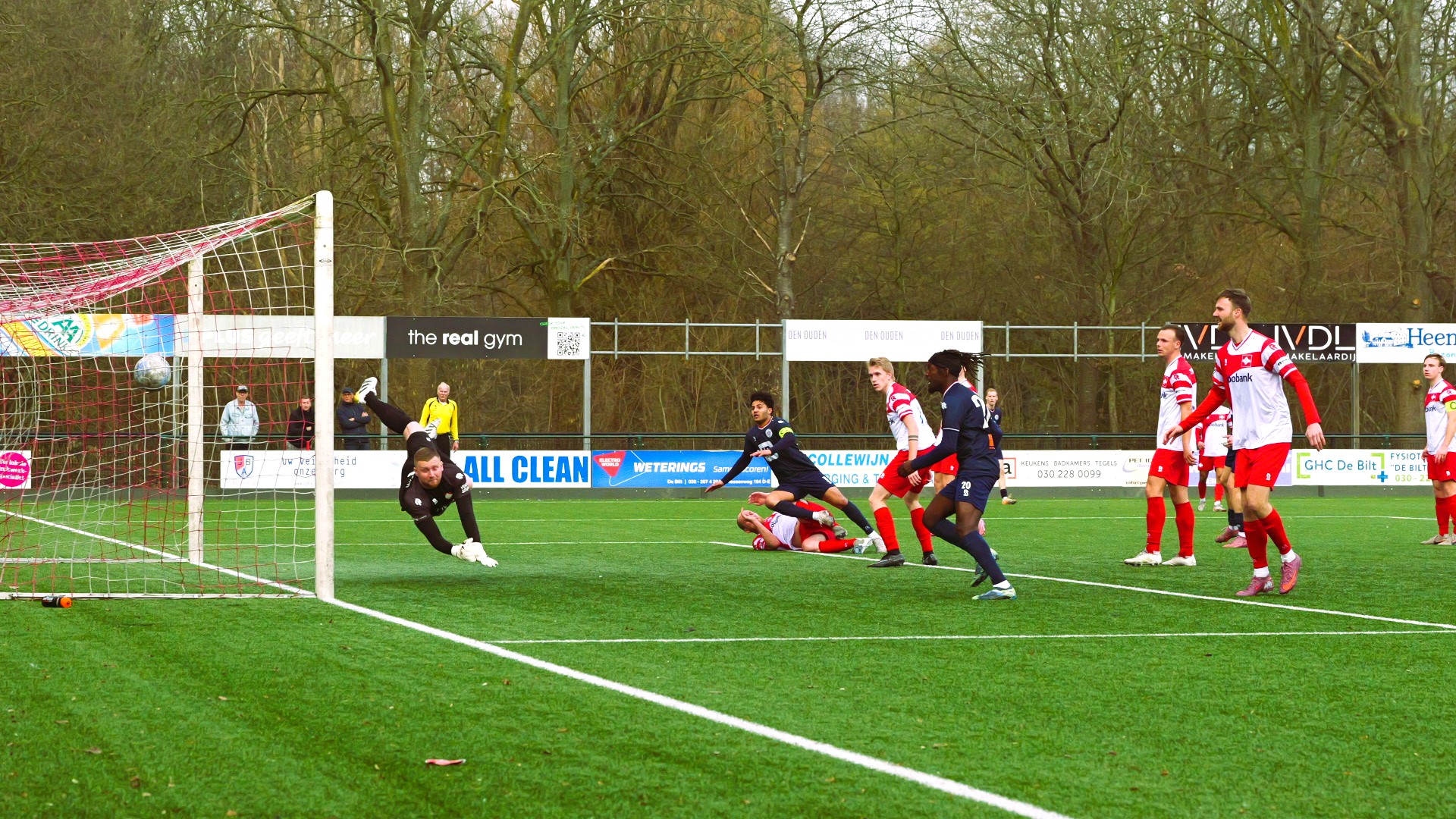 Niet veel later is het Ryan Godee die vanaf de rechterflank een prima voorzet aflevert. Hoe is het mogelijk vraagt iedereen zich af dat uitgerekend Timo Meerding tussen drie verdedigers van de thuisploeg, de bal met zijn kruin weet te verlenging richting tweede paal. Keeper Menno Vink moet zich volledig strekken om onheil te voorkomen maar dat is toch onvoldoende. De bal ploft via het zijnet onbereikbaar voor Vink, binnen. Een geweldig mooi doelpunt wat je soms alleen in het betaalde voetbal ziet. Klasse Timo.